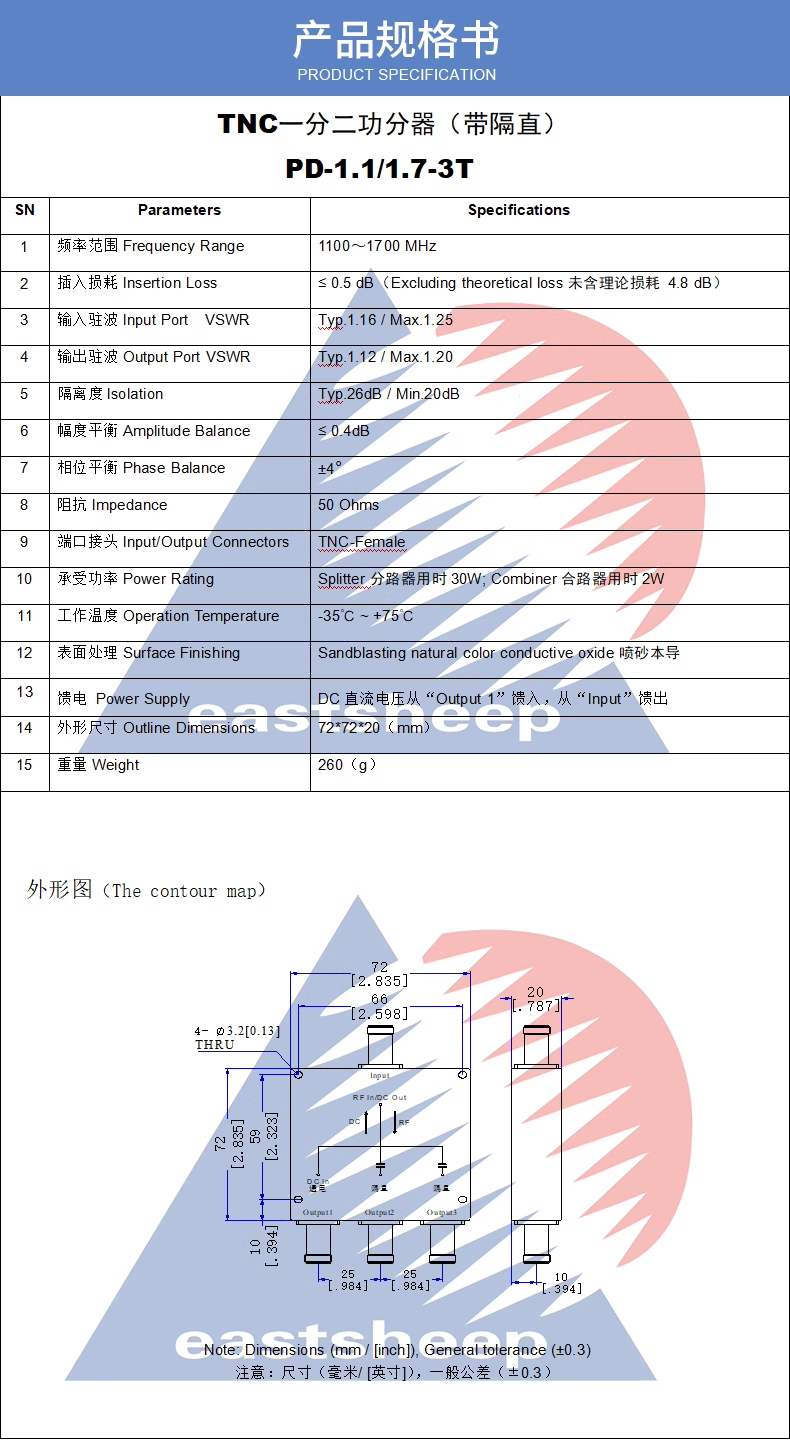 東方旭普TNC一分三功分器 1100-1700MHz GPS一分三功分器 帶隔直 PD-1.1/1.7-3T