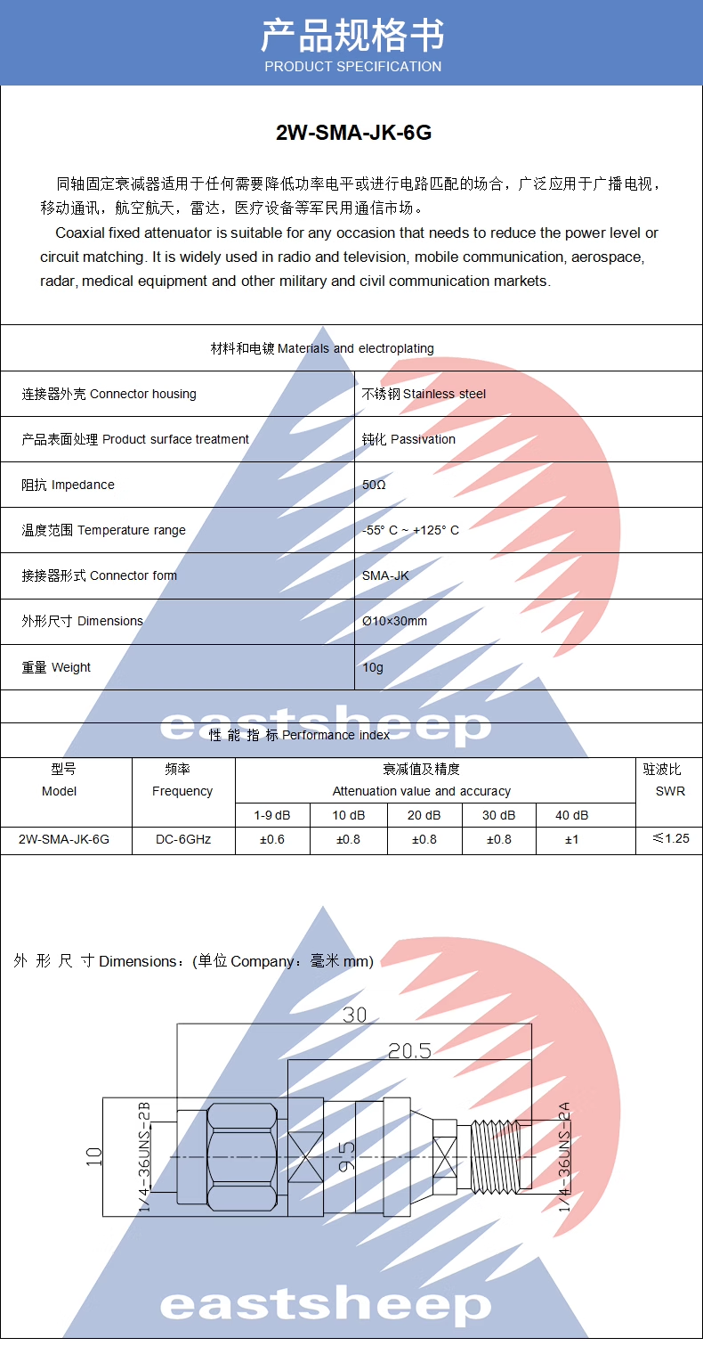 射頻同軸固定不銹鋼 2W衰減器SMA-JK 1/3/5/6/10/15/20/30DB 6G