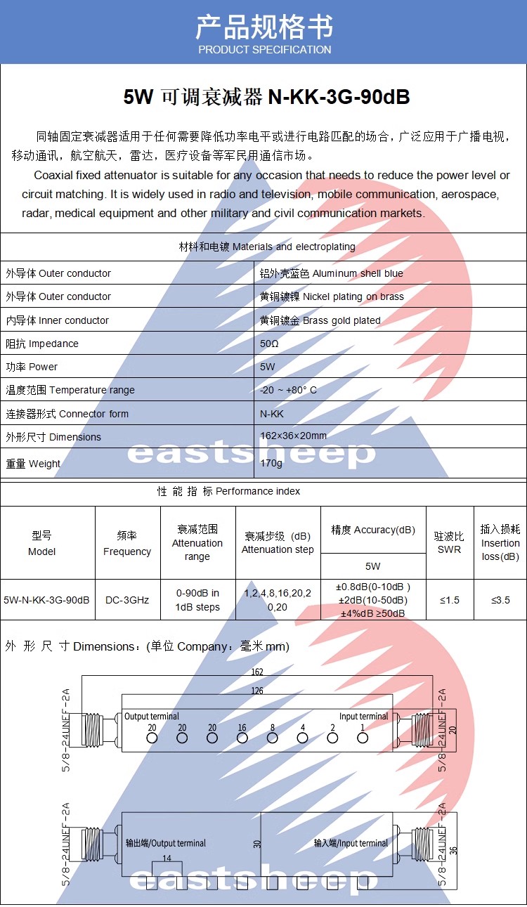 東方旭普 5W可調(diào)衰減器 N-KK N型步進(jìn)式按鍵衰減器 0-90dB DC-3G